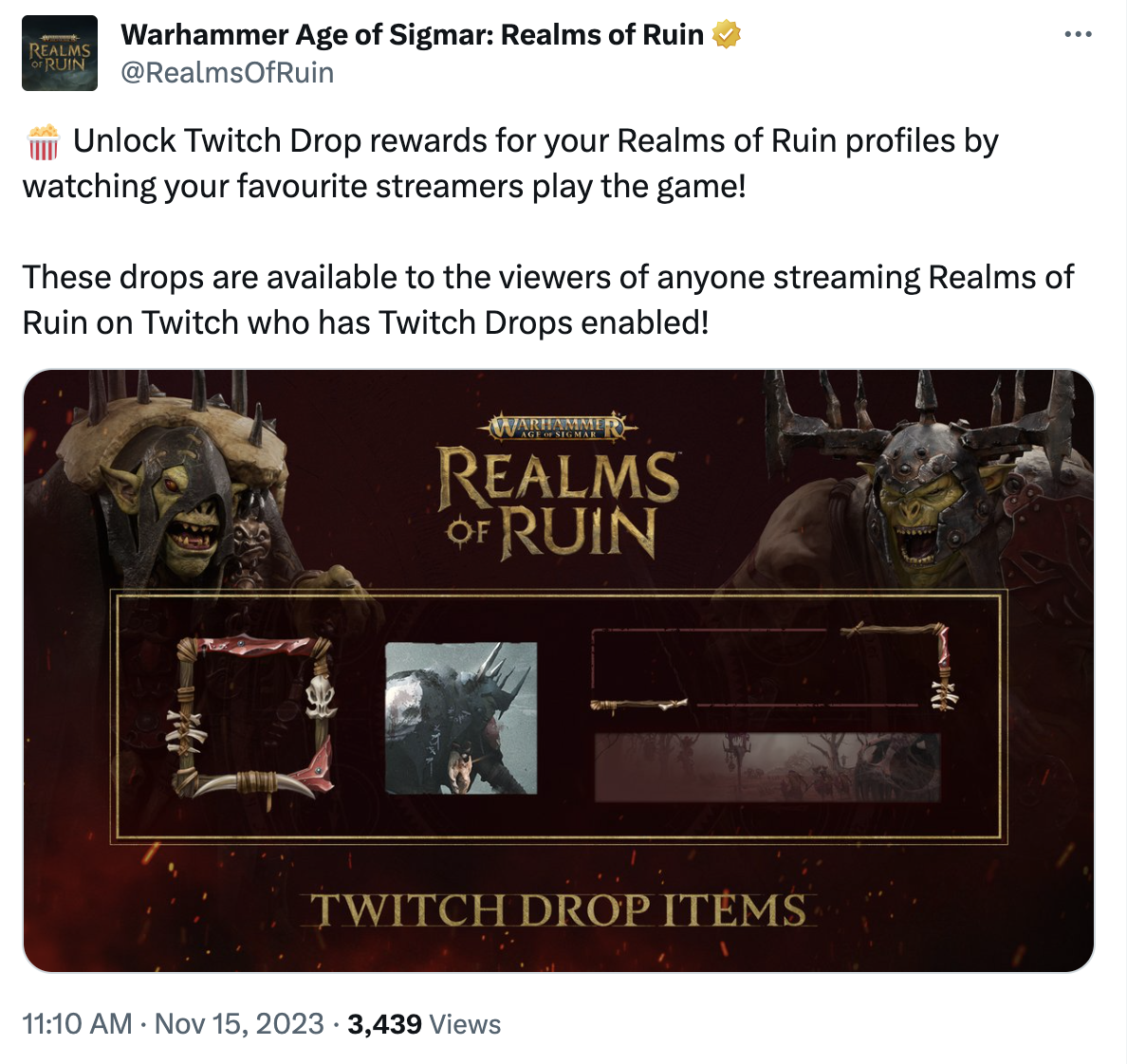 Warhammer employed both strategies – early access, and Twitch Drops – for the launch of "Warhammer Age of Sigmar: Realms of Ruin," and saw outstanding results.