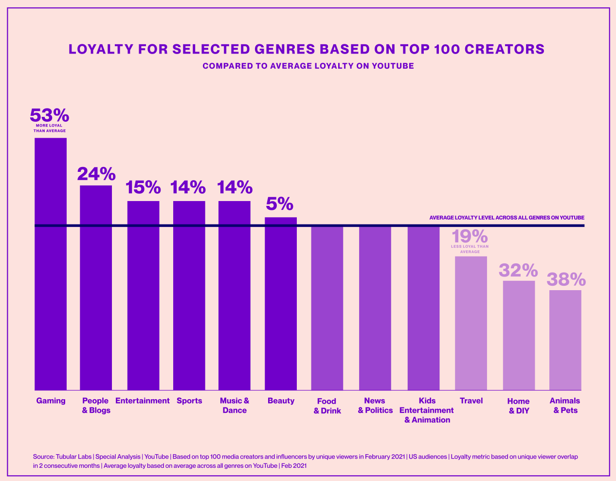 Moreover, the research showed that the audience loyalty on YouTube differs heavily by content genre with gaming viewers being >50% more loyal than the average, proving these audiences stick to the creators they like and follow.
